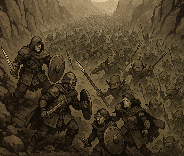 A small band of elite scouts has discovered a massive Goblin host moving toward the capital. Ambushed and outnumbered, the scouts have occupied a narrow, rocky choke point at the mouth of a canyon.